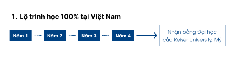 Lộ trình học 100% (toàn bộ 4 năm) chương trình nguyên bản của Mỹ tại Việt Nam có thể xem là lựa chọn tiết kiệm nhất, cũng là 1 trong 2 lộ trình được sinh viên KUV lựa chọn nhiều nhất vì sẽ được nhận cùng một loại văn bằng và bảng điểm như học trực tiếp tại Keiser University tại Florida trong khi mức học phí chỉ bằng 1/8 so với du học trực tiếp tại Mỹ. Nếu sinh viên muốn đổi sang lộ trình chuyển tiếp du học trong quá trình học tập tại Việt Nam vẫn có thể linh hoạt chuyển tiếp.