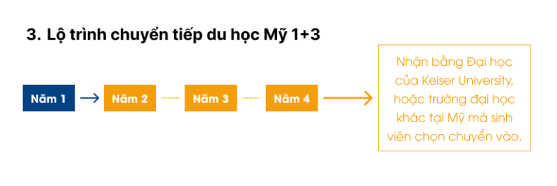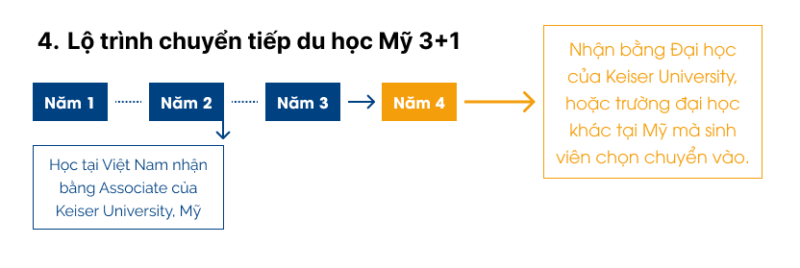 Lộ trình 3 + 1 phù hợp cho sinh viên có mong muốn học phần lớn chương trình với mức học phí dễ tiếp cận tại Việt Nam nhưng vẫn có 1 năm cuối học tại Mỹ. Với lộ trình này, sinh viên sẽ được Keiser University tại Mỹ ghi nhận sau khi hoàn tất 2 năm đầu và tiếp tục Năm 3 (giai đoạn chuyên ngành) tại Việt Nam. Sinh viên sẽ chuyển tiếp trường chính Keiser University tại Mỹ để học Năm 4 và nhận bằng Đại học. Sinh viên cũng có tùy chọn chuyển vào các đại học khác trên khắp nước Mỹ hoặc các quốc gia khác để học các môn còn lại của bậc đại học.