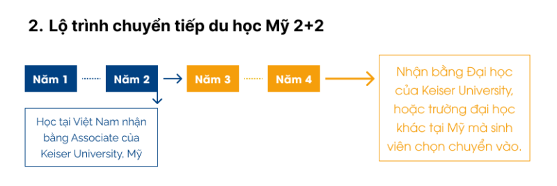 Lộ trình học 2 + 2 là lựa chọn phổ biến nhất của sinh viên KUV. Sau khi hoàn tất 2 năm đầu tại KUV, sinh viên sẽ được Keiser University tại Mỹ ghi nhận và chuyển tiếp 2 năm cuối. Sinh viên cũng có thể tùy chọn chuyển tiếp tại trường chính Keiser University tại Florida hoặc các trường đại học khác trên khắp nước Mỹ hoặc các quốc gia khác như Úc, Canada, Thuỵ Sĩ,… Trong trường hợp này, sinh viên sẽ nhận bằng cử nhân (Bachelor) của trường tại Mỹ hoặc các quốc gia mà sinh viên chọn chuyển tiếp vào. Sinh viên được khuyến khích sử dụng GPA trong 2 năm đầu học tập tại KUV để đăng ký các suất học bổng của các trường đối tác tại Mỹ và các quốc gia khác trên thế giới.
